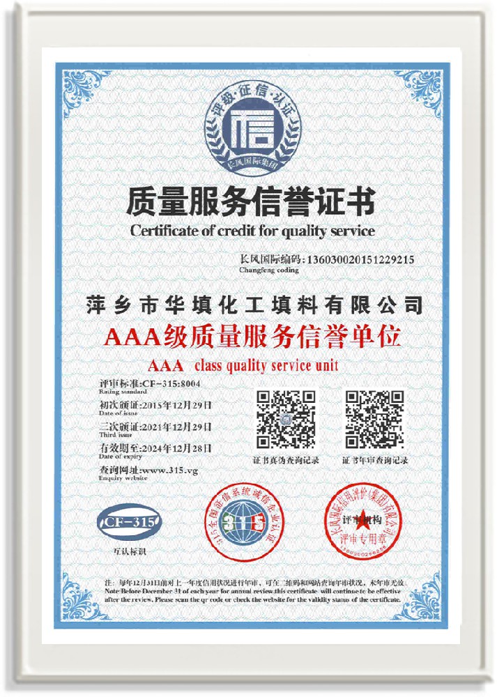 萍鄉市華填化工填料有限公司,位于320國道、109國道、浙贛鐵路、昌金高速公路貫穿其中,交通便利,是江西西部一顆燦爛明珠,創建于20世紀70年代初期,是中國石油天然氣股份有限公司“能源一號網”會員企業、中國石化物資采購電子商務網絡和中國海洋石油總公司采辦業務系統成員單位,是上海大學江西材料基因組工程產業研究院工業陶瓷產業創新聯盟基地,且通過ISO9001:2015質量管理體系、ISO14001:2015環境管理體系、ISO45001:2018職業健康安全管理體系認證的化工填料生產企業。公司擁有陶瓷、塑料、金屬填料、催化劑、活性氧化鋁、分子篩等產品生產線,現有固定資產3616萬元,占地面積3.8萬平方米。公司具有悠久的生產歷史、雄厚的技術力量和先進的生產工藝設備,可生產工業瓷球(支撐劑)、陶瓷、金屬、塑料質的規整、散堆化工填料及分子篩、催化劑、生化濾料、活性氧化鋁、石化助劑、活性炭、環保材料、耐火材料等系列的200多種規格型號產品。